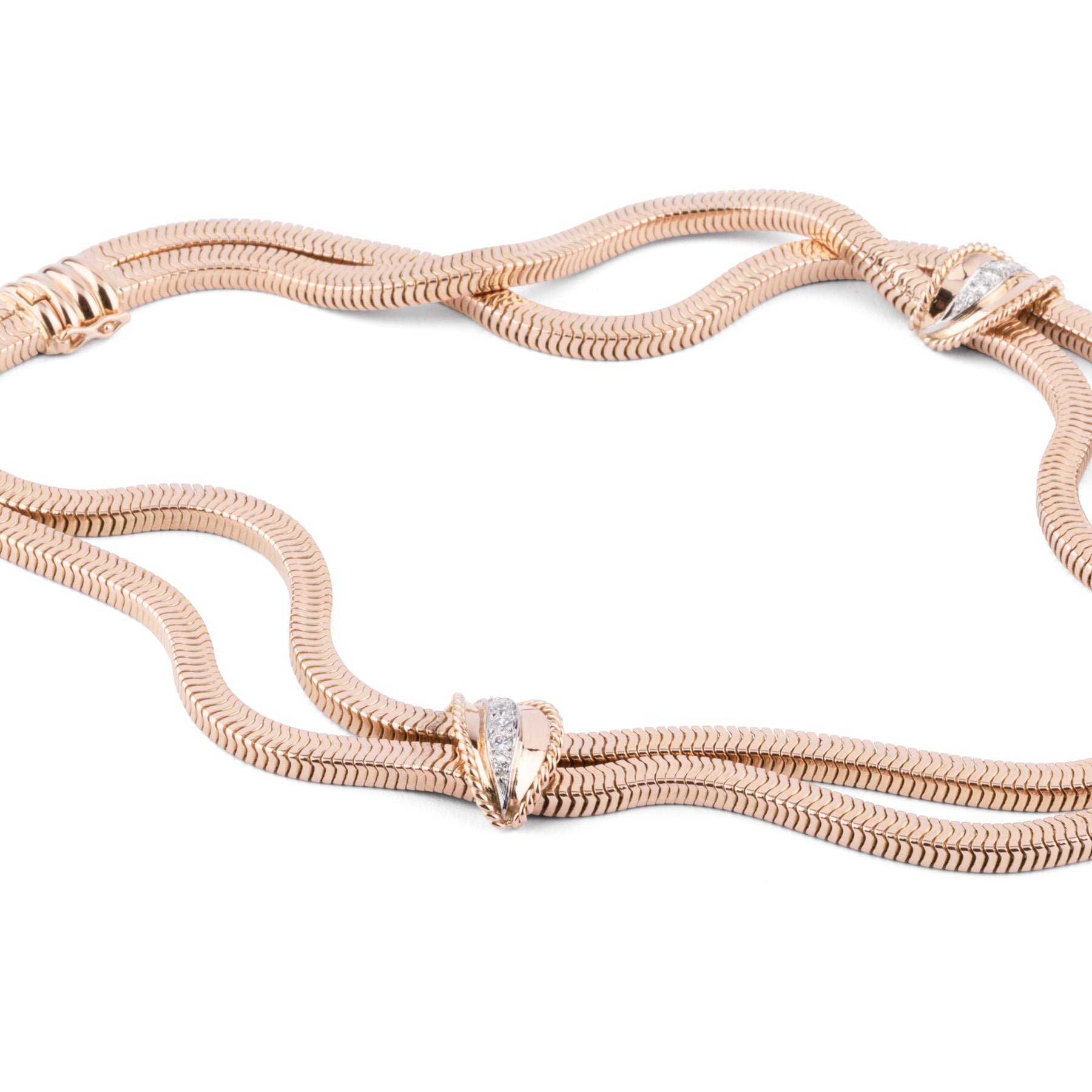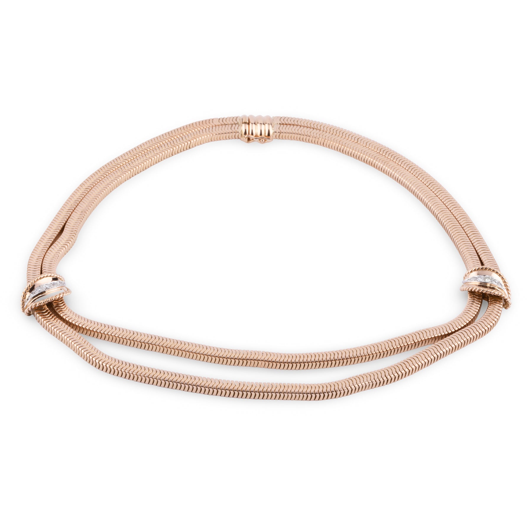 Collier or jaune double rang maillon lisse ,retenu par 2 feuilles en or jaune soulignés en diamants