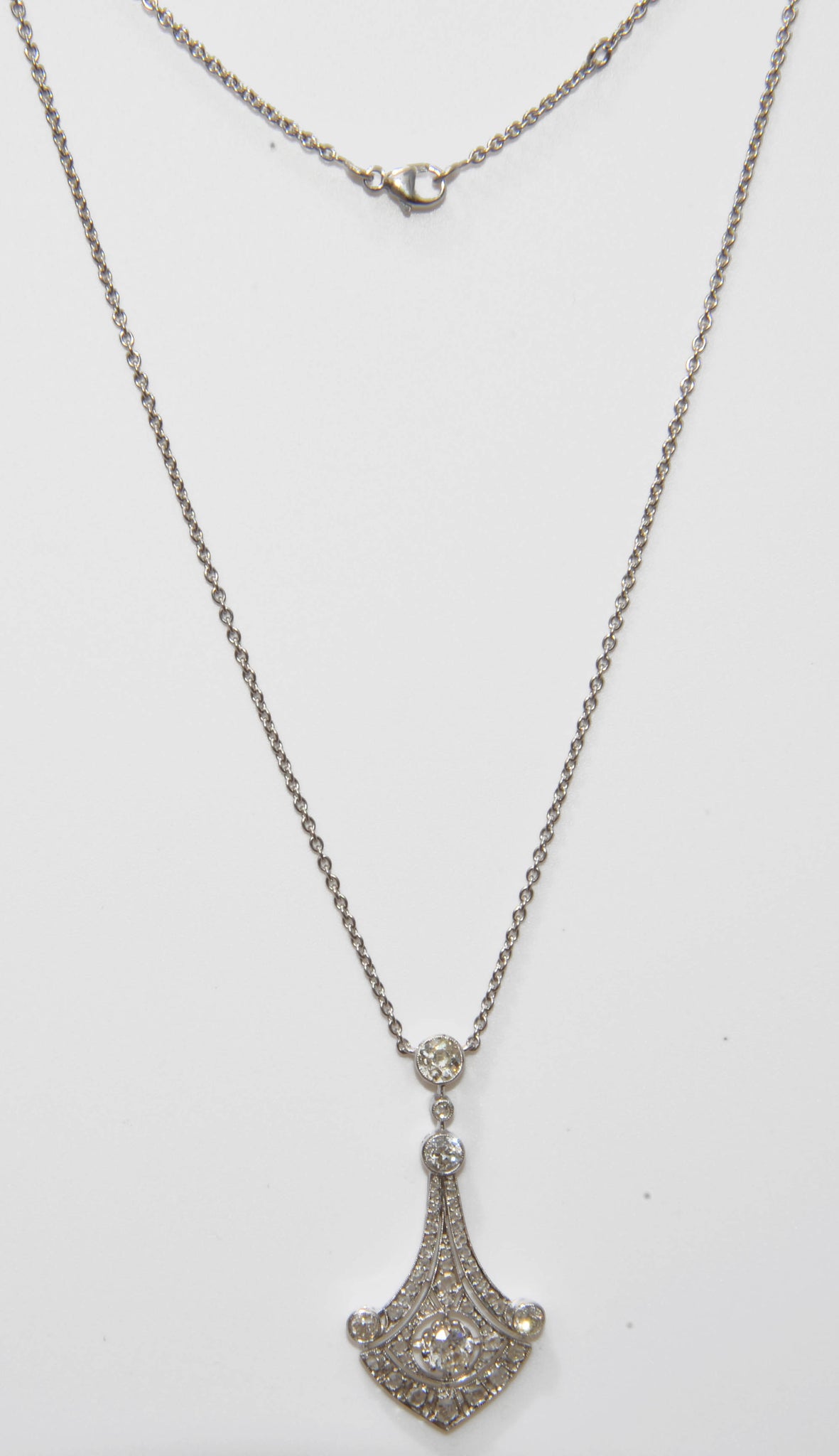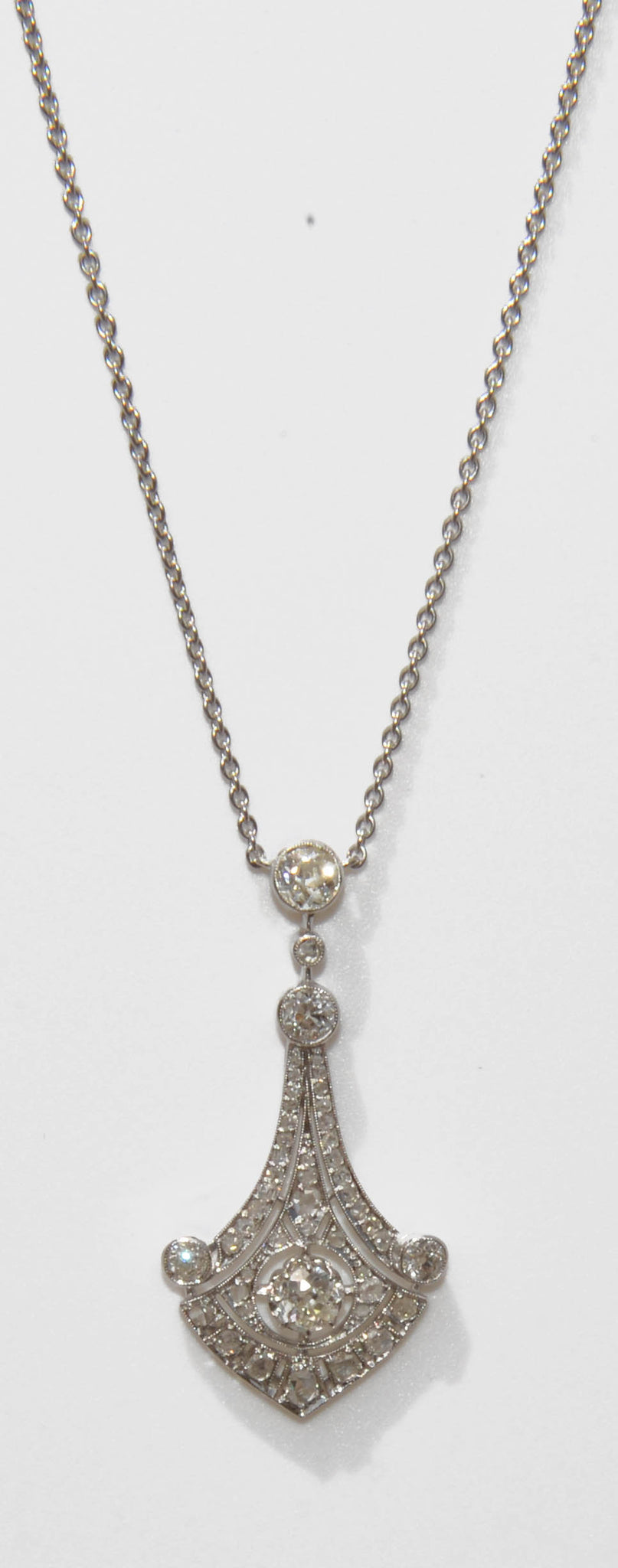 Collier or platine et diamant formant une palmette délicatement pavées de diamant taille ancienne et de diamant taillé en rose sur une chaine en or gris maille forçat ronde.