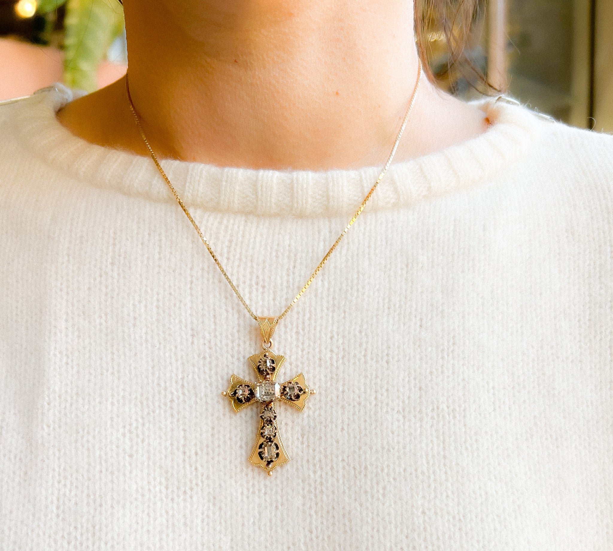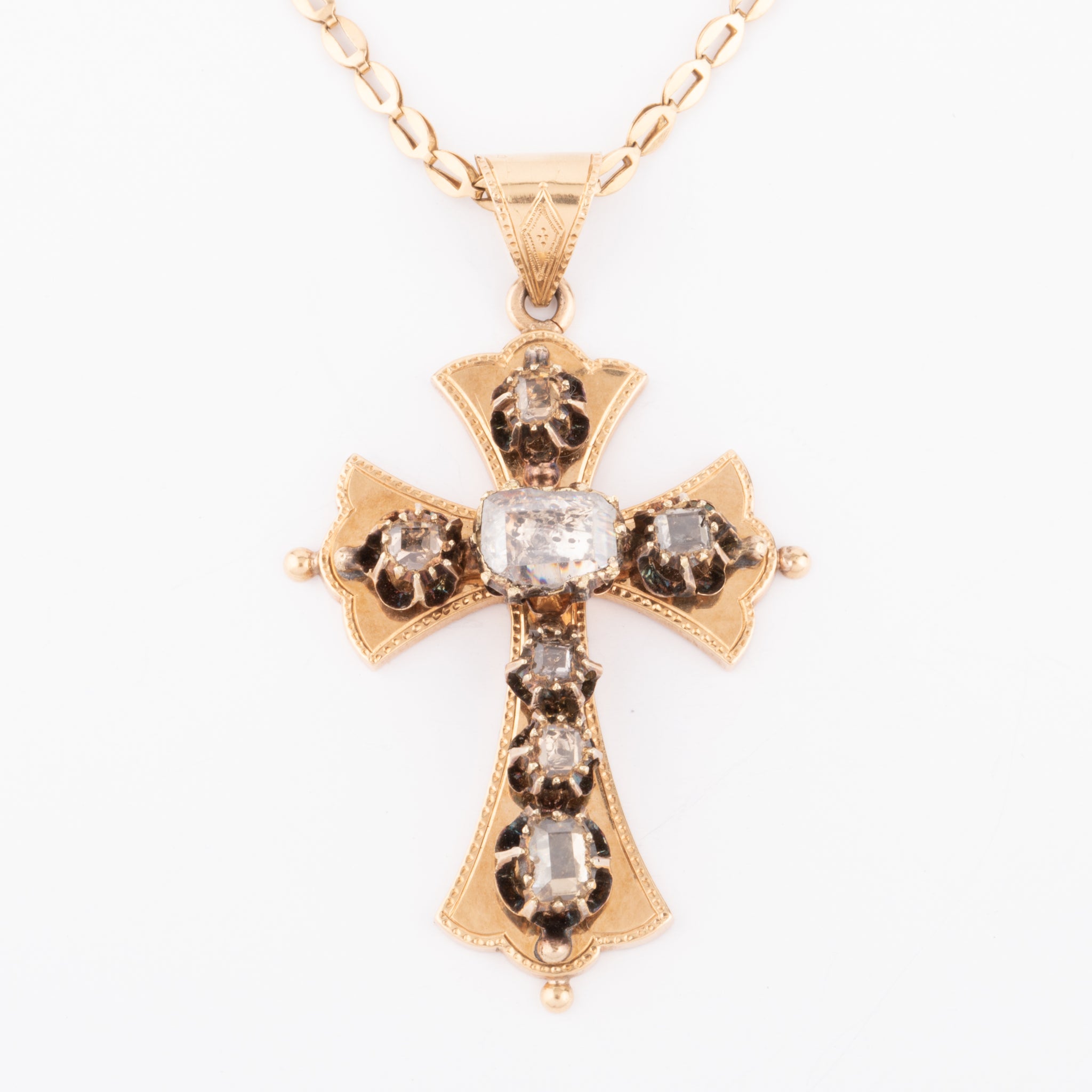 Croix provençale en or et diamant ornée en son centre d'un diamant taille émeraude.