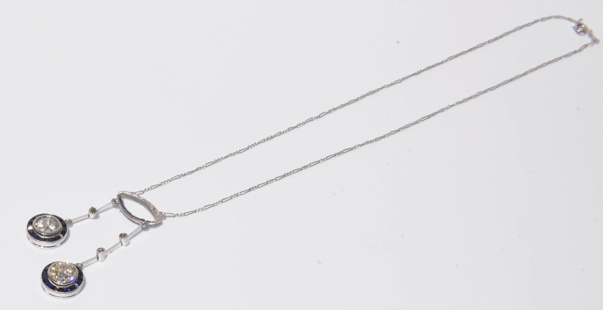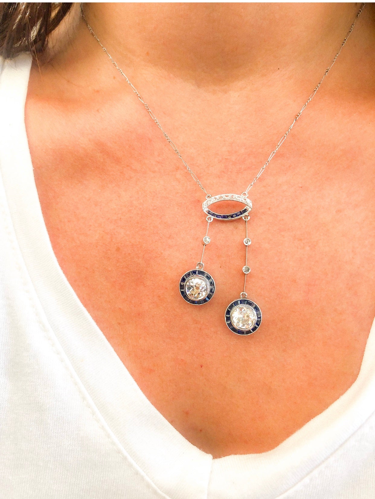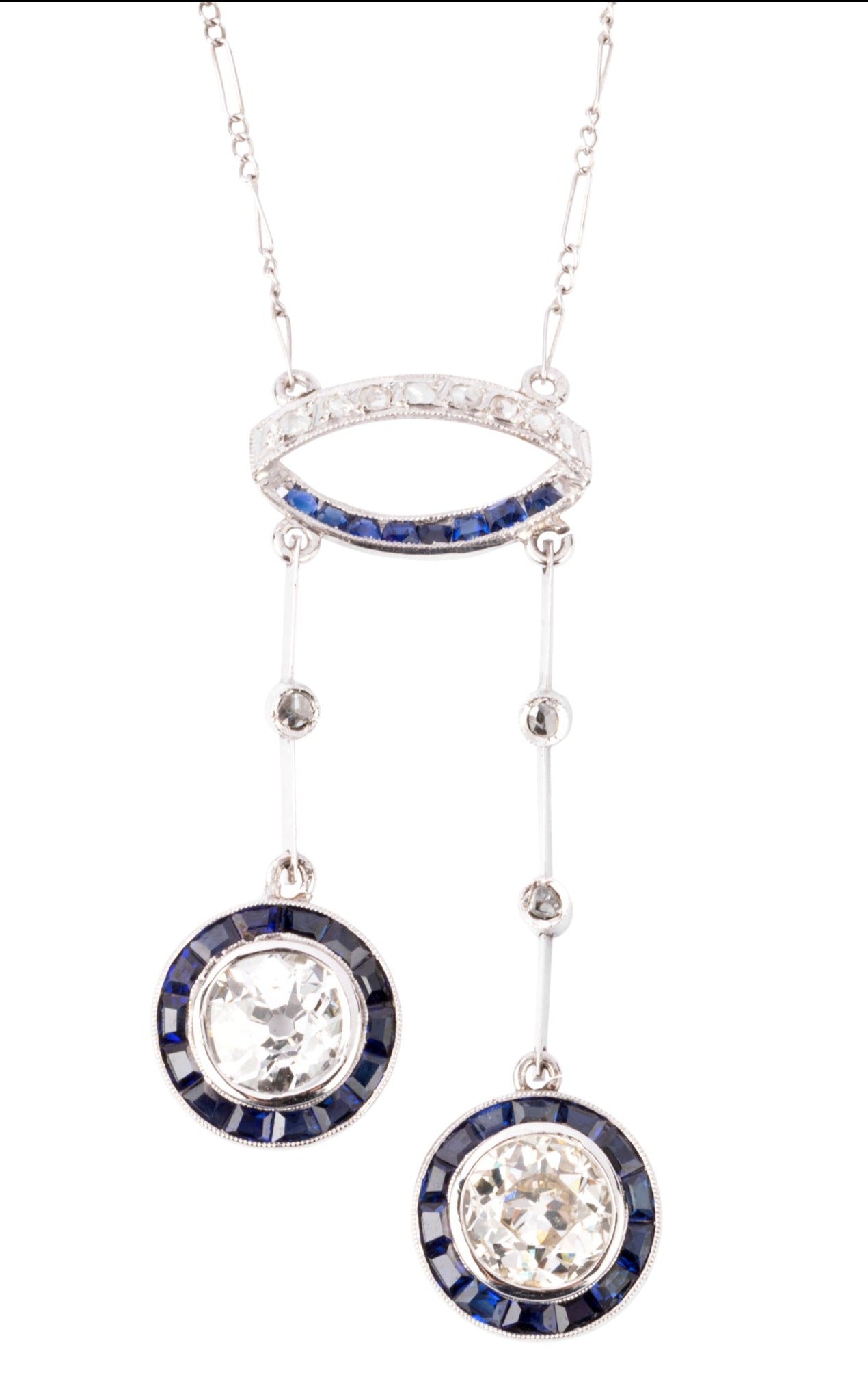 Collier dit Négligé serti de 2 diamants taille ancienne joliment entouré de saphirs calibrés le tout retenu par une chaine maille gourmette.