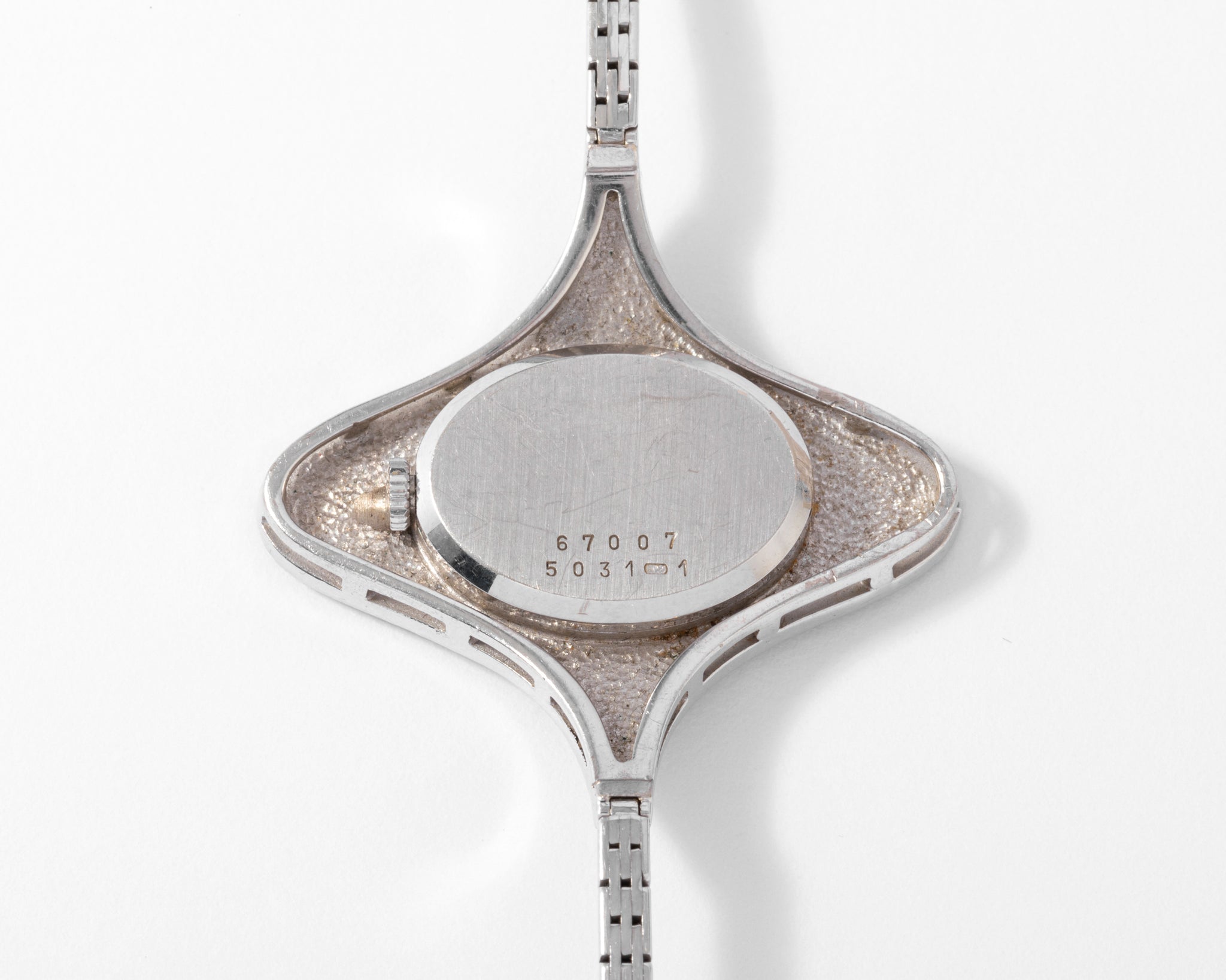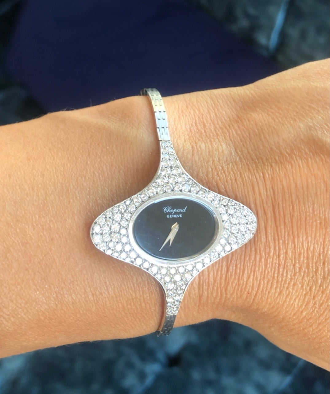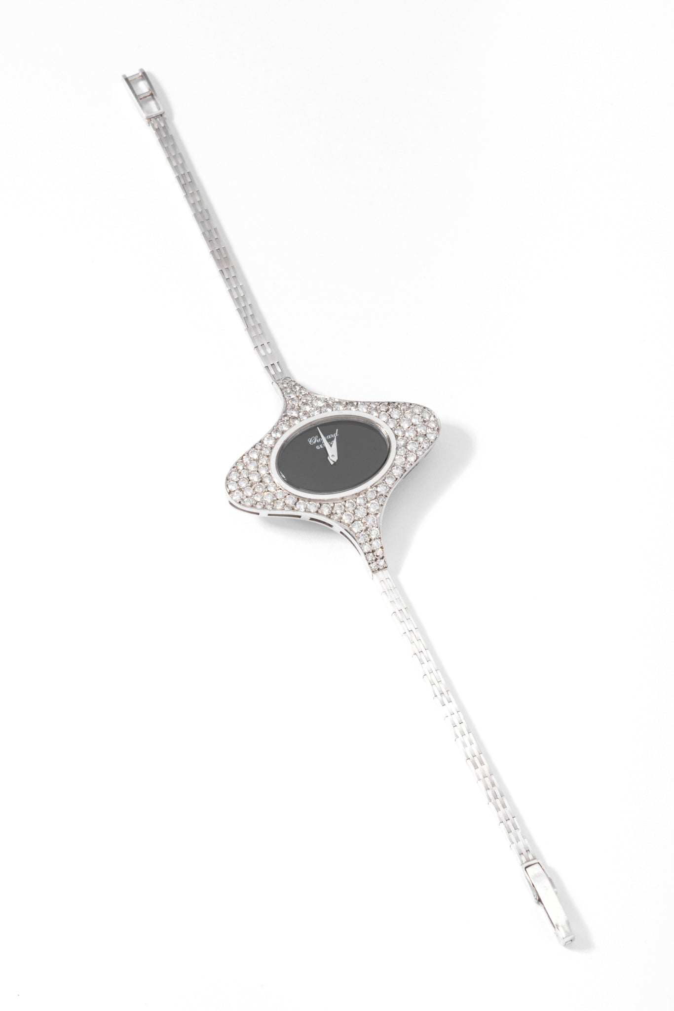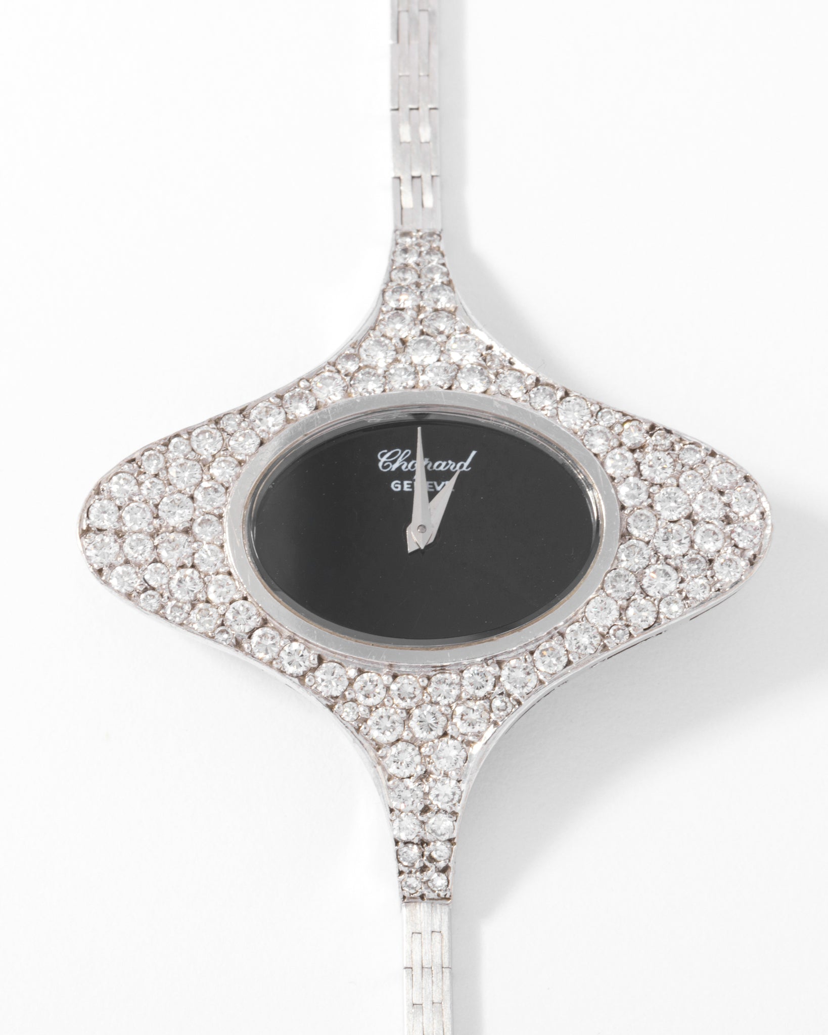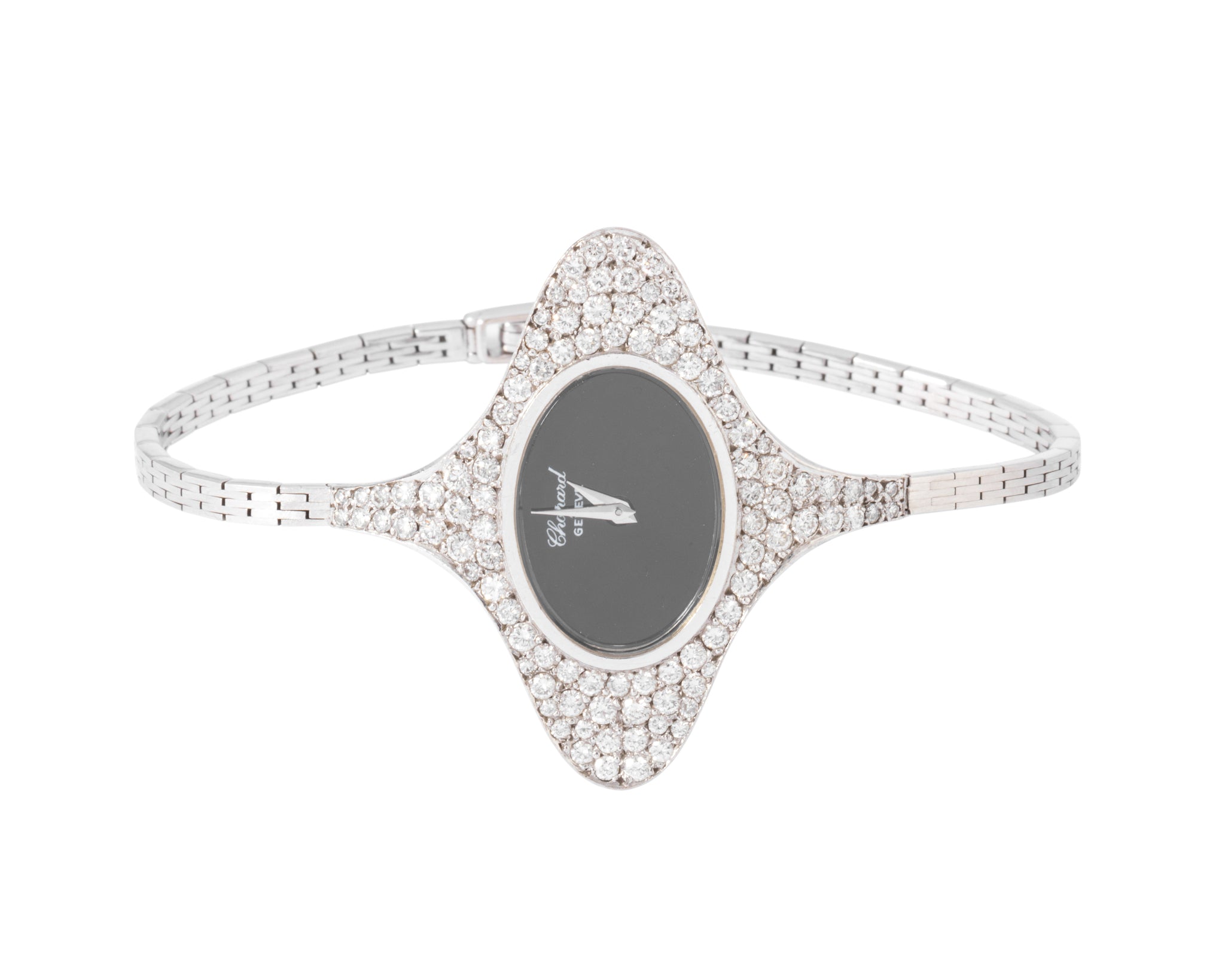 Originale Montre en or gris de la maison Chopard ornée d'un entourage ovale en diamants, le mouvement est à mouvement mécanique.