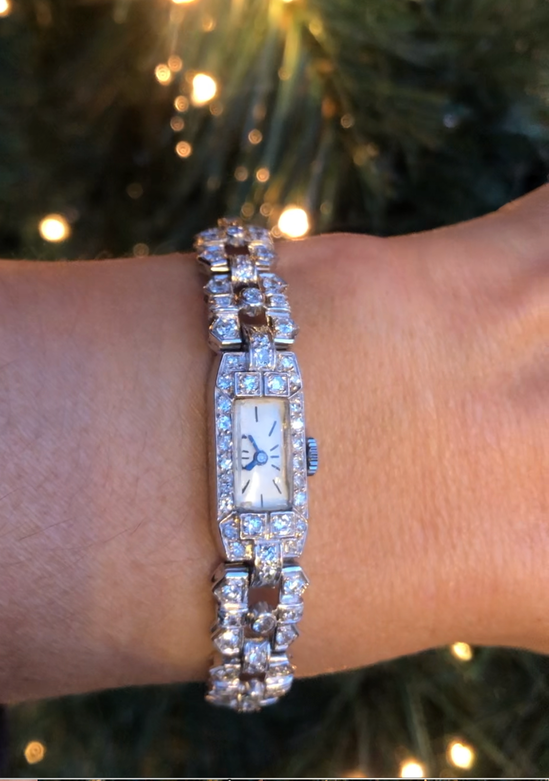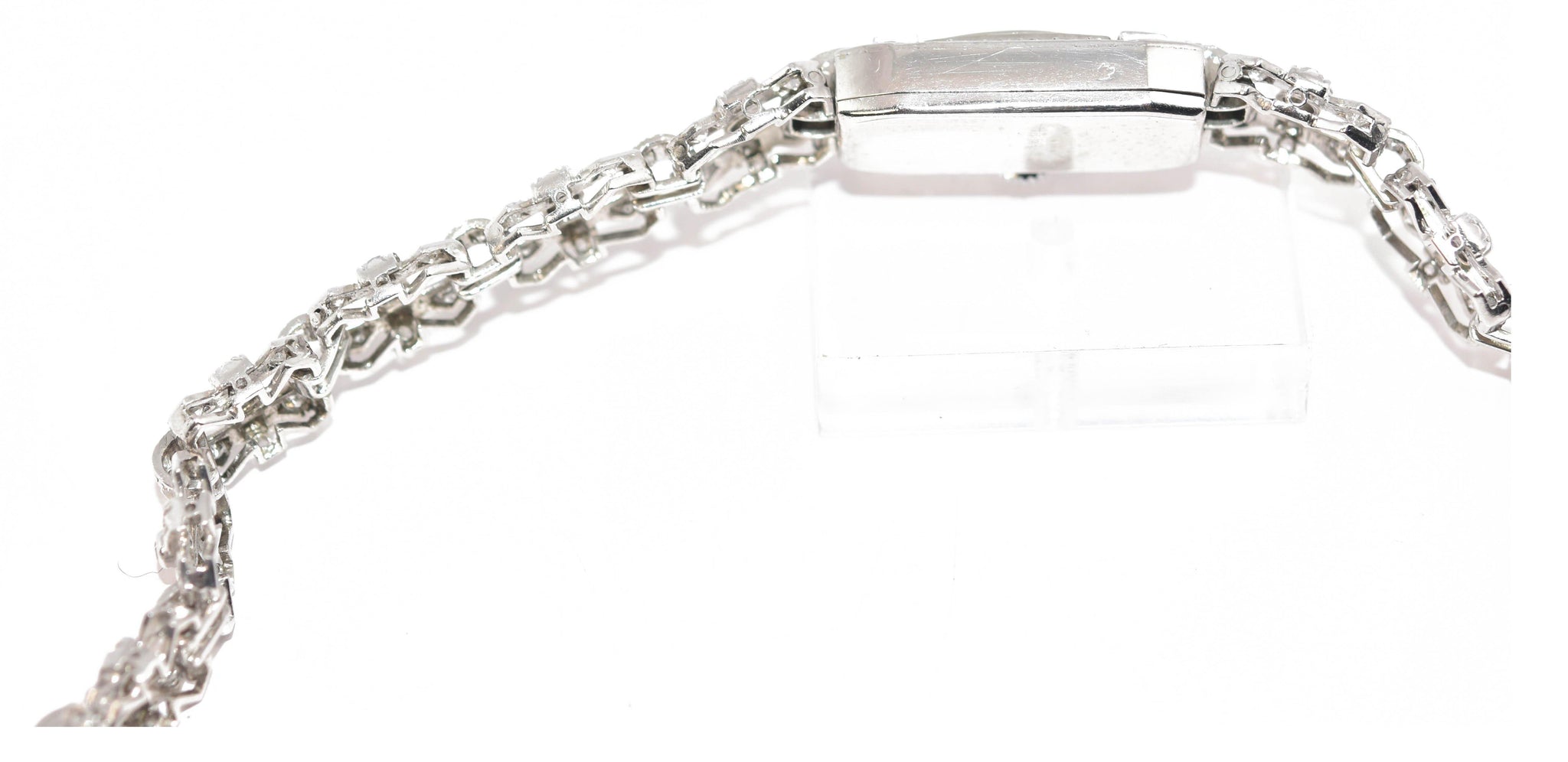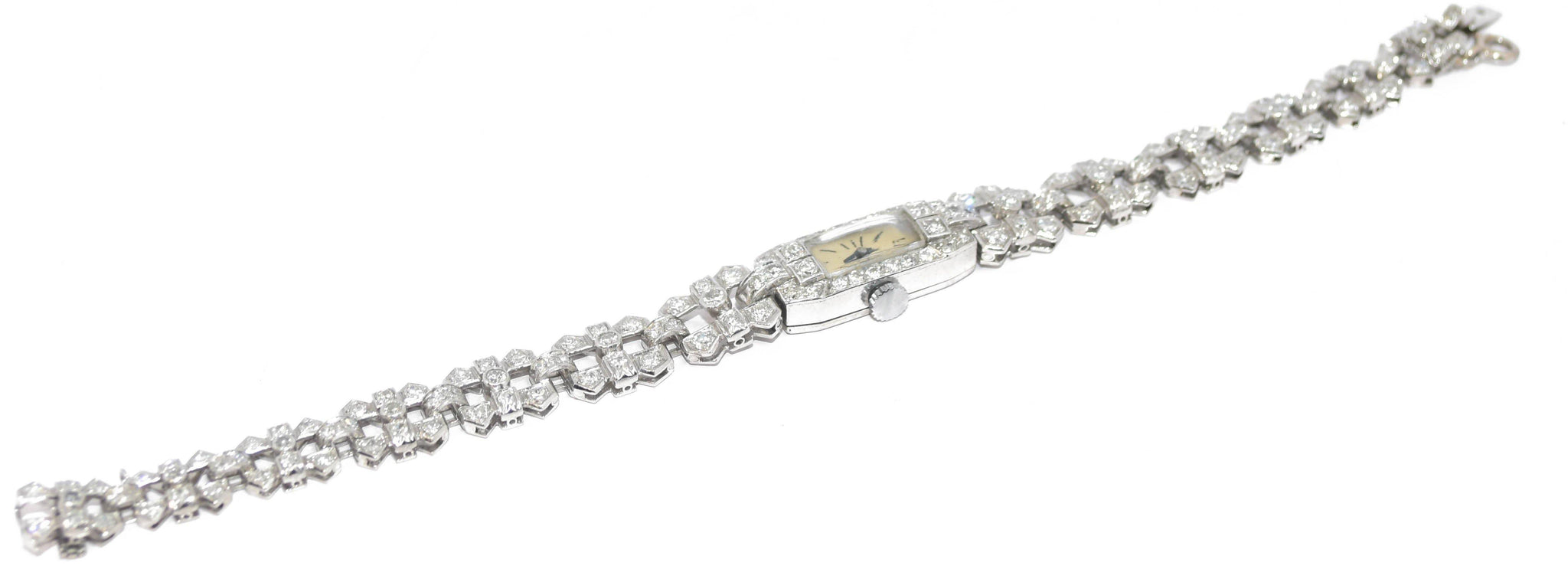 Belle Montre en platine rectangulaire mouvement mécanique enrichie de tous ses maillons entièrement pavée de diamants taille ancienne.
