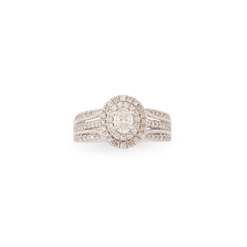 • Bague en or gris ornée d'un diamant ovale et pavée de diamants