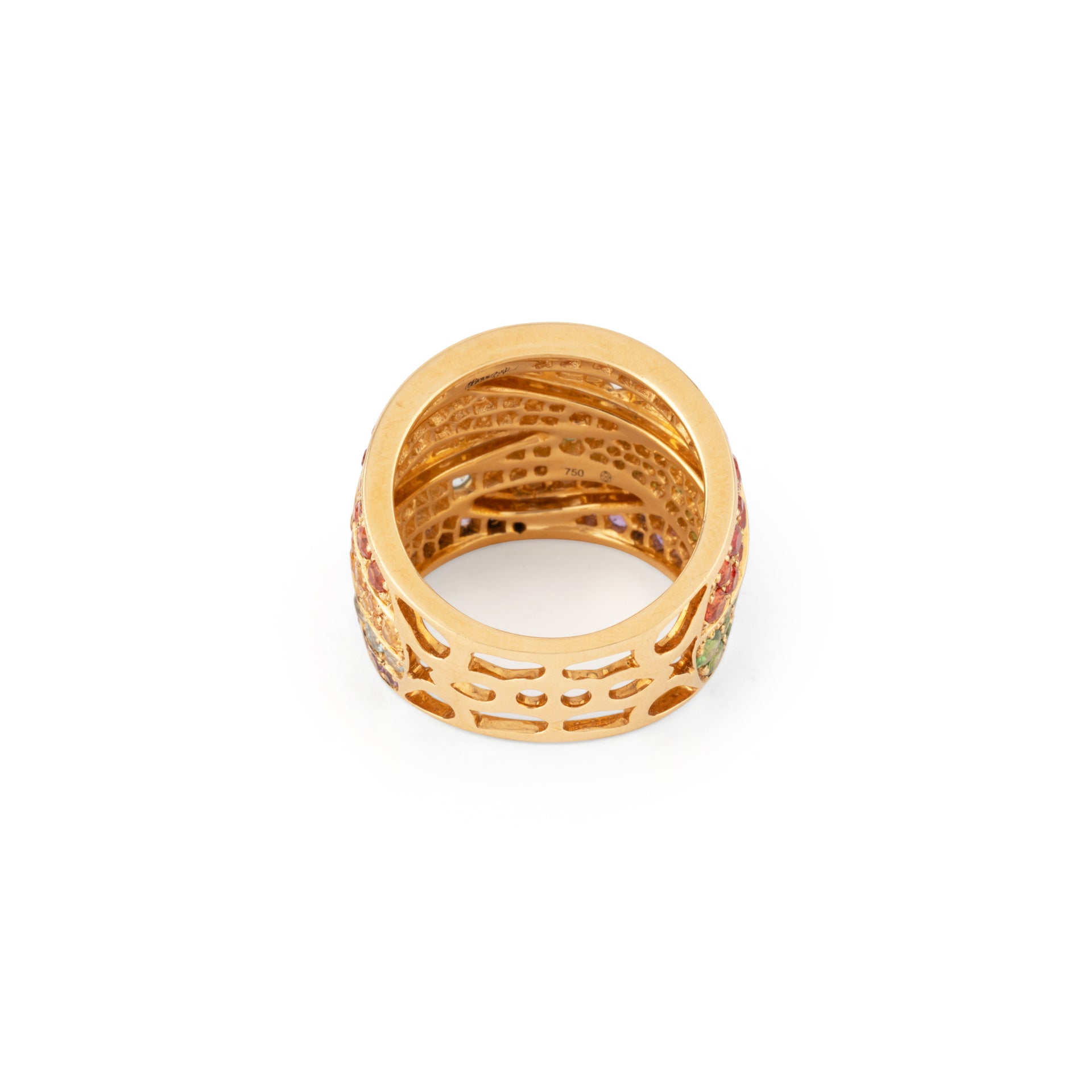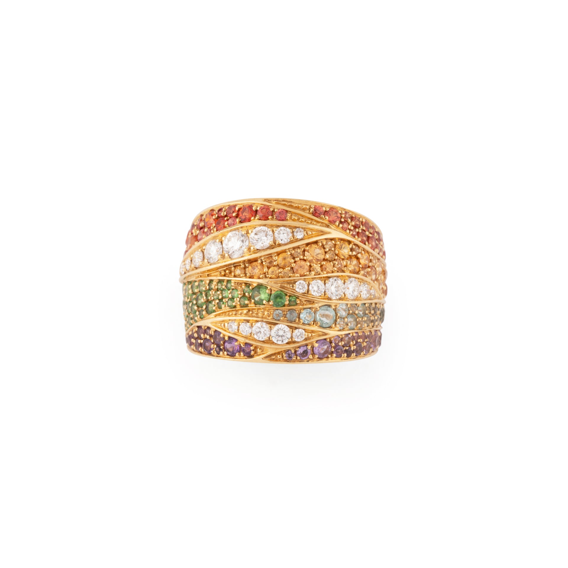 Bague bandeau en or jaune sertie de bandes d'améthystes rondes, de diamants taille brillant, d'aigues-marines et de saphirs oranges.