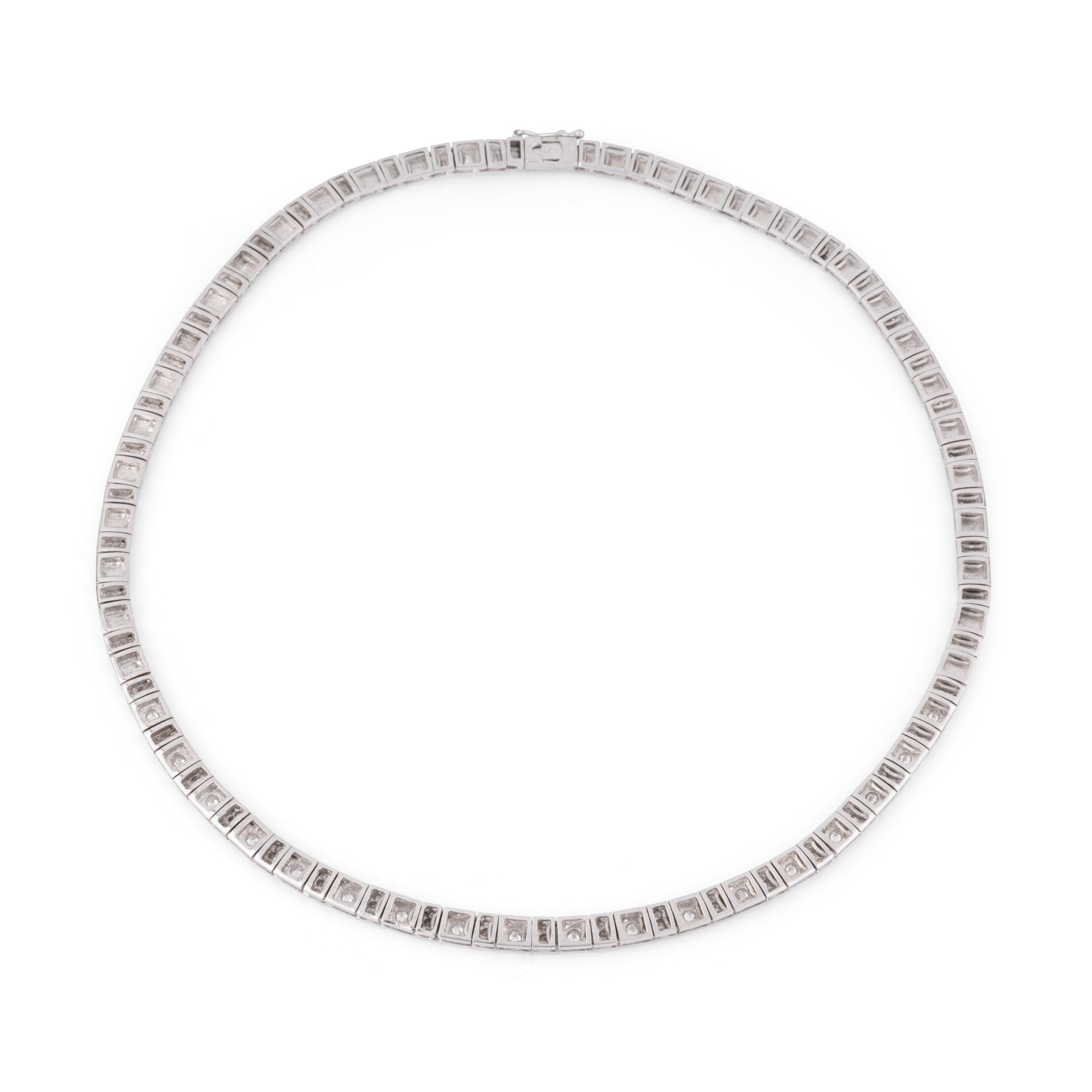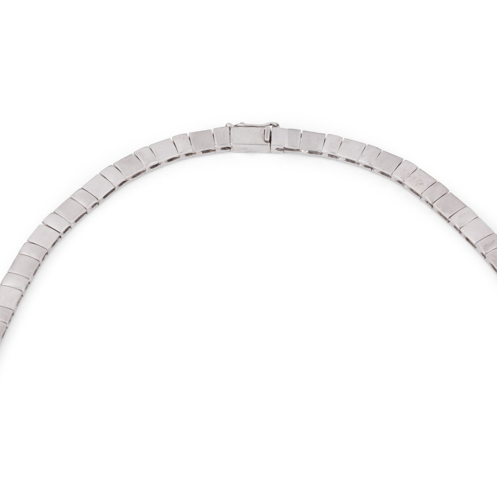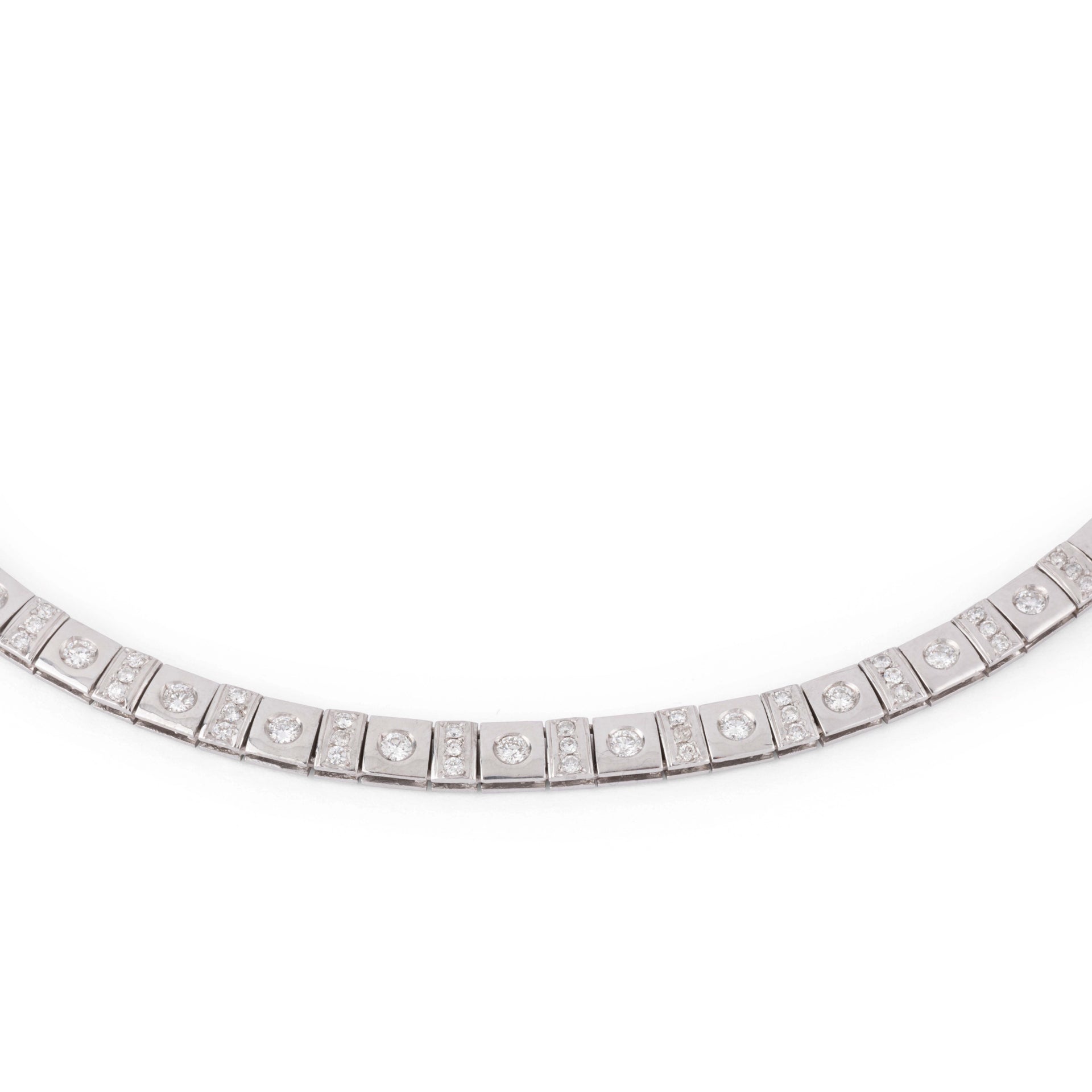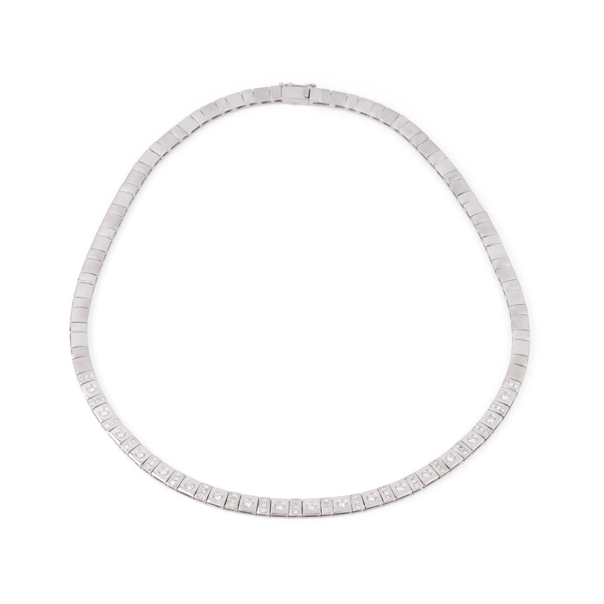 Collier en or gris orné d'une succession de maillons carrés, pavés sur le devant alternant des maillons avec 3 diamants et des maillons ornés de 1 diamant taille brillant totalisant environ : 2,40 cts