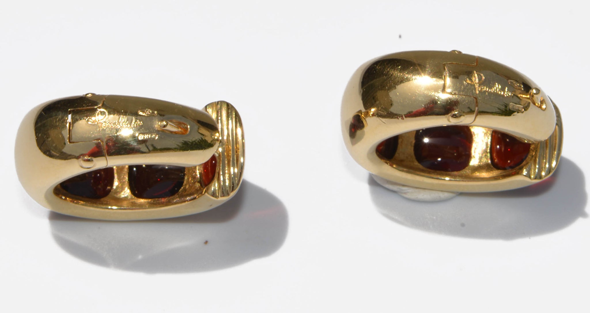 Boucles d'oreilles en or jaune de la maison Pomellato modèle Bisanzio .Chaque boucle est ornée avec de 3 cabochons de grenats.