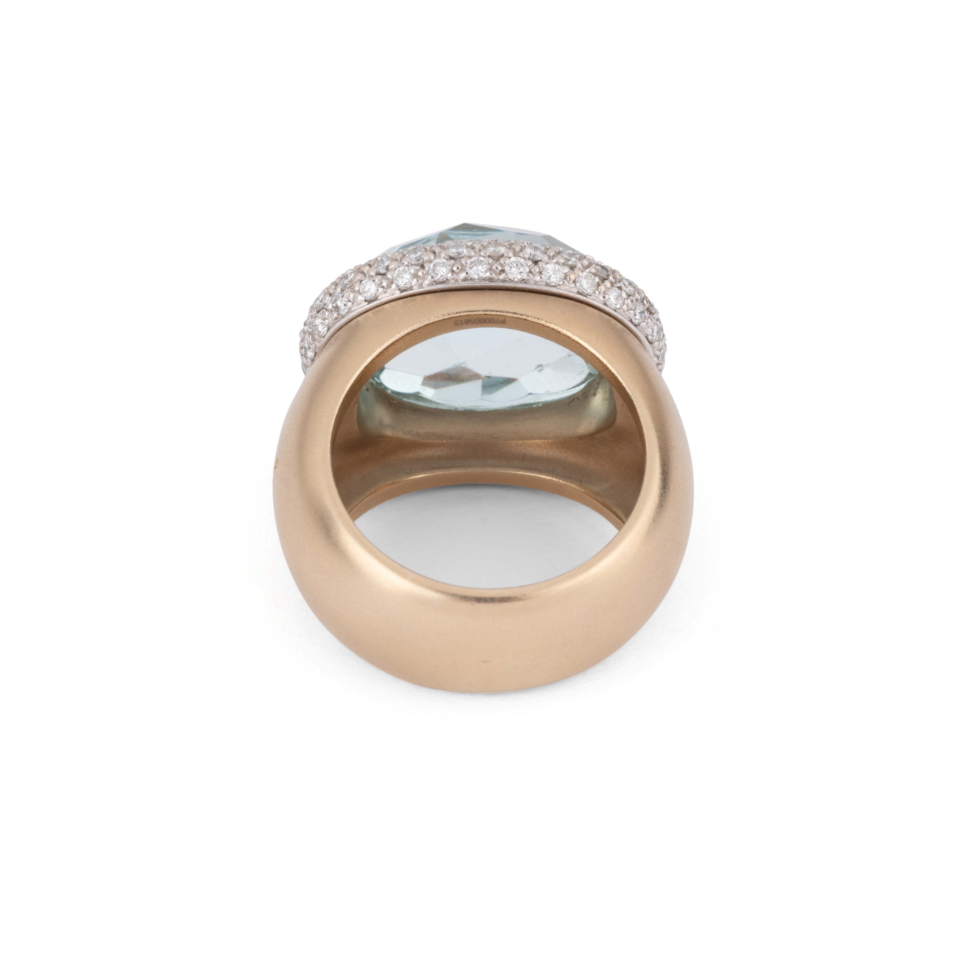 Bague or rose sablé signée de la maison italienne Pomellato modèle iceberg ornée d'un cabochon de Aigue marine ovale facettée rehaussée d'une belle bordure bombée en or blanc entièrement pavée de 2 rangs de diamants de taille brillant.