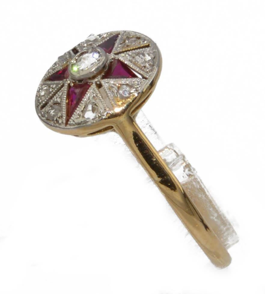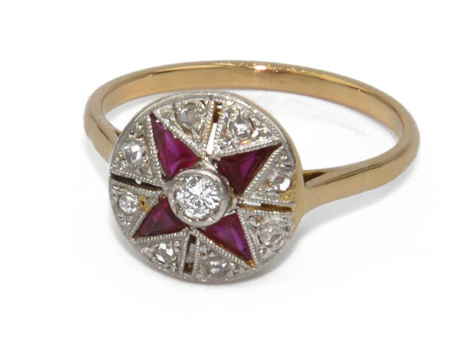 Bague ornée d'un chaton rond géométrique centré d'un diamant taille brillant dans un entourage de roses et pierres de synthèse rouge triangulaires.