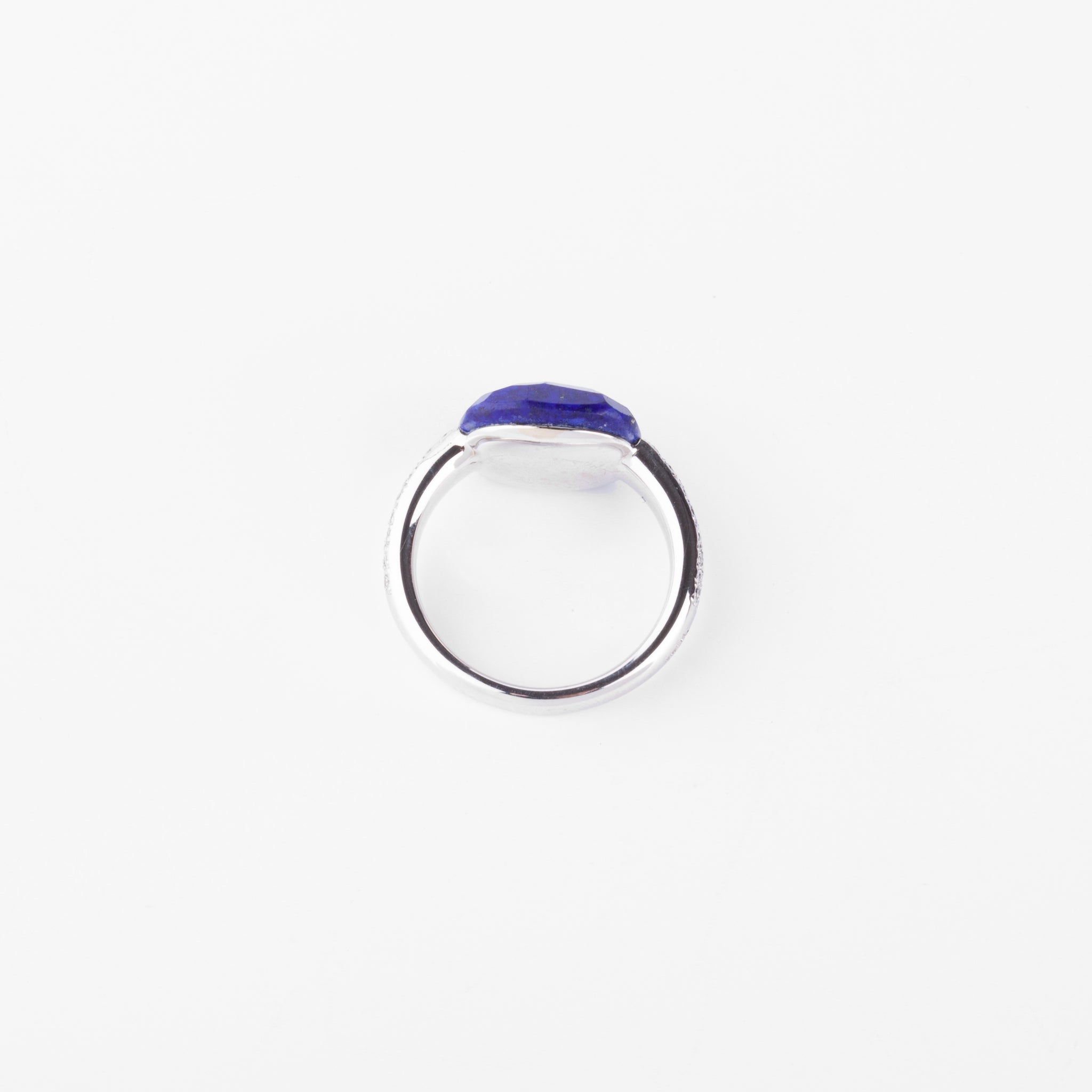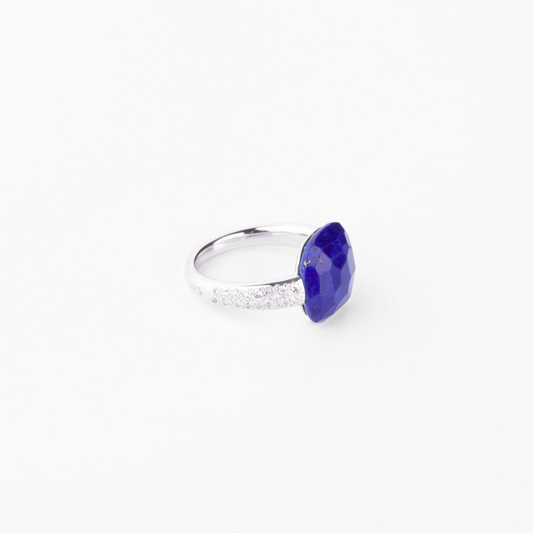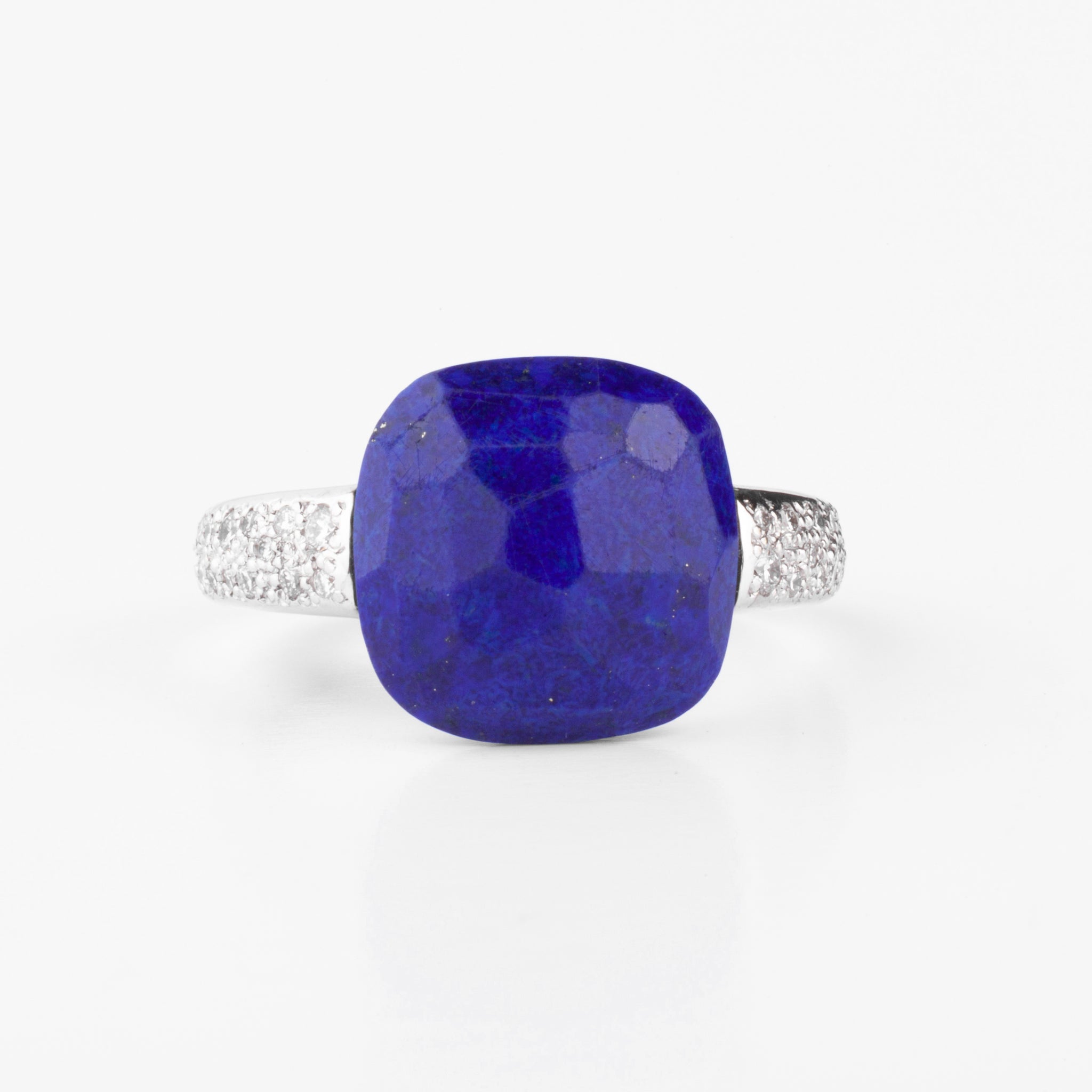 Une bague signée de la Maison Pomellato, collection 'Capri' ornée d'un lapis lazuli  de forme coussin épaulée de part et d'autre de diamants taille brillant.