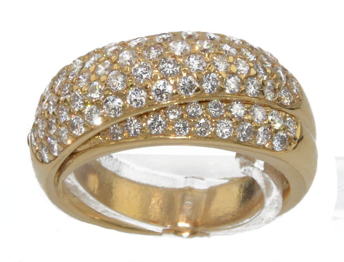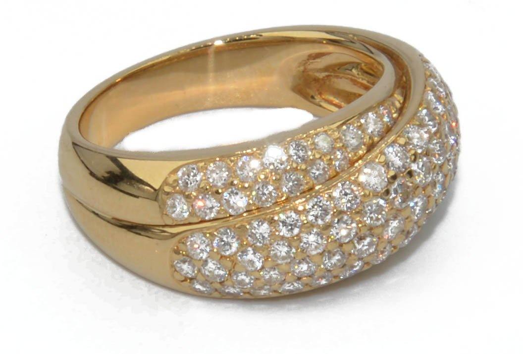 Élégante bague jonc croisé en or jaune l'anneau bombé sur le dessous et les 2 anneaux sur les côtés est entièrement pavés de diamants taille brillant.