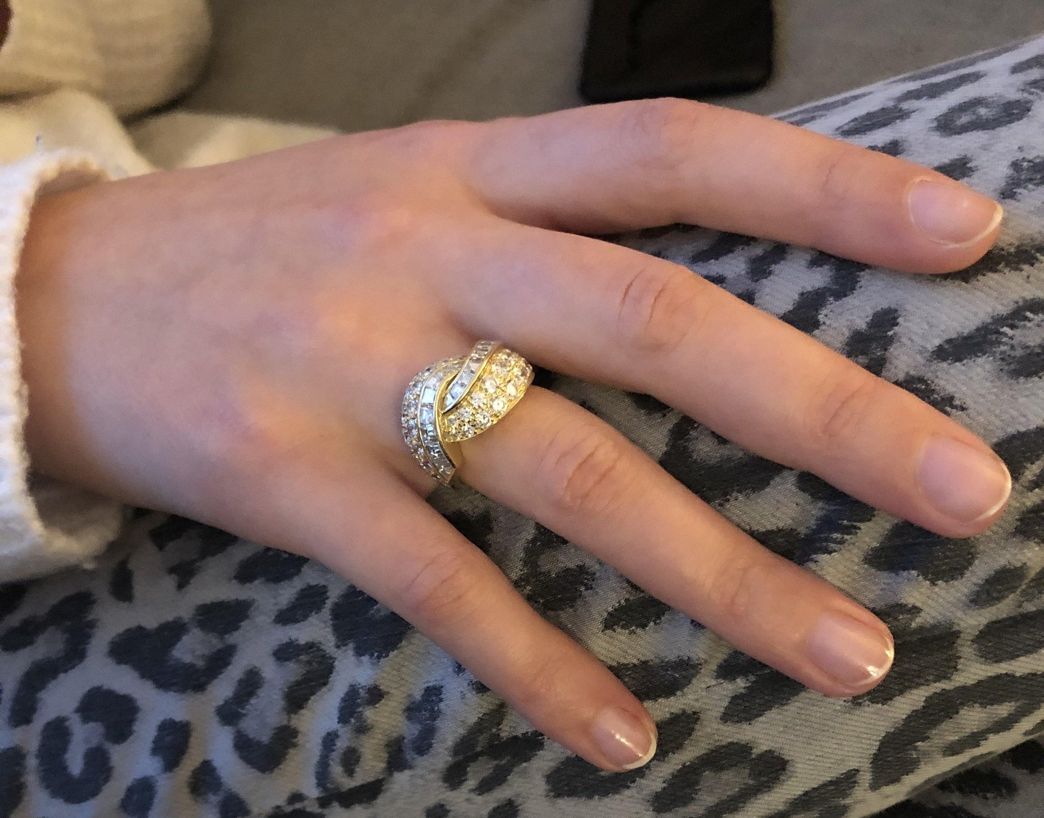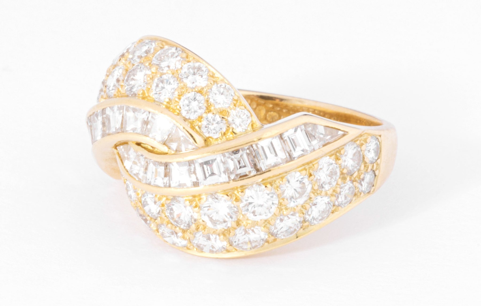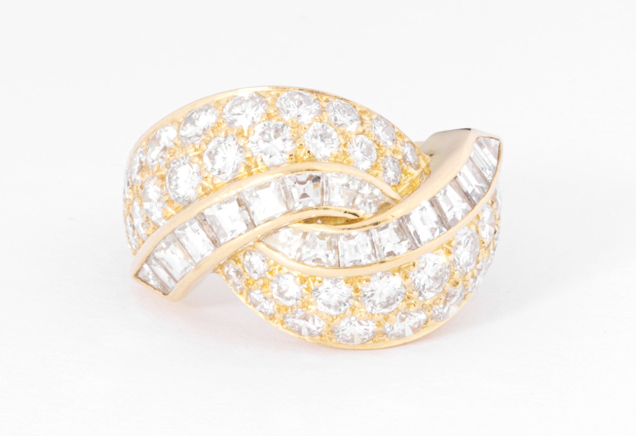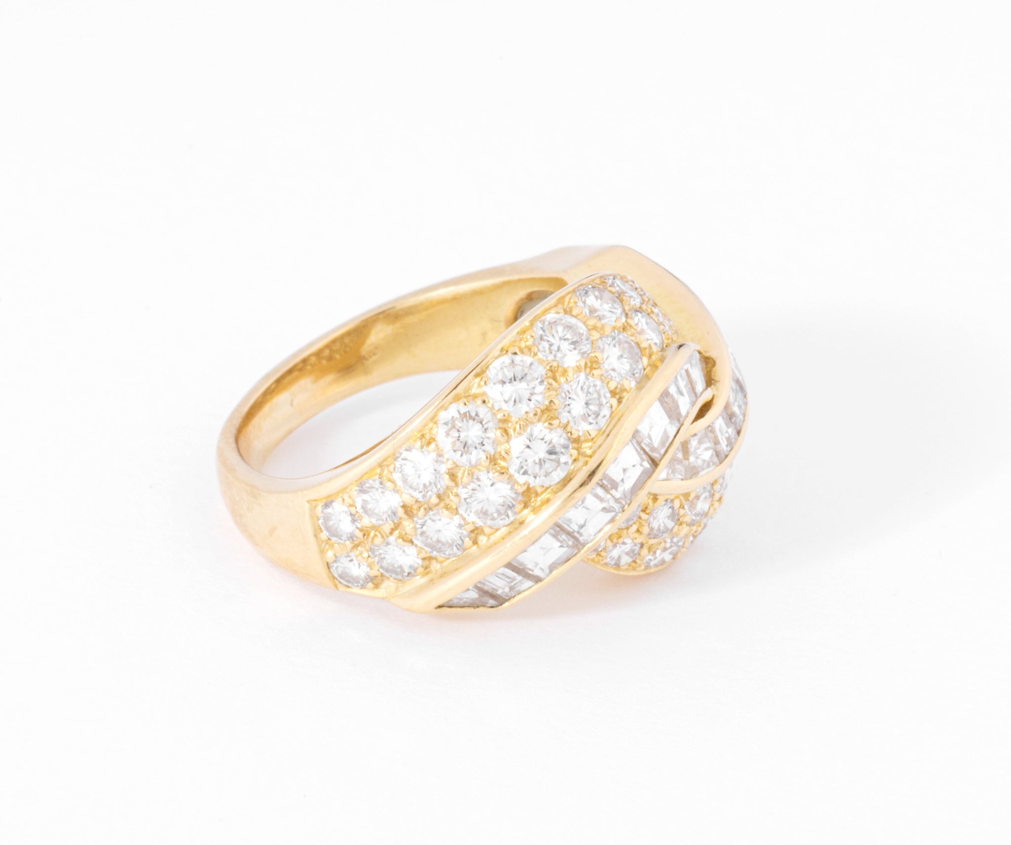 Bague nœud en or jaune traversée par une ligne de diamants princesse rehaussée d'un pavage de diamants.