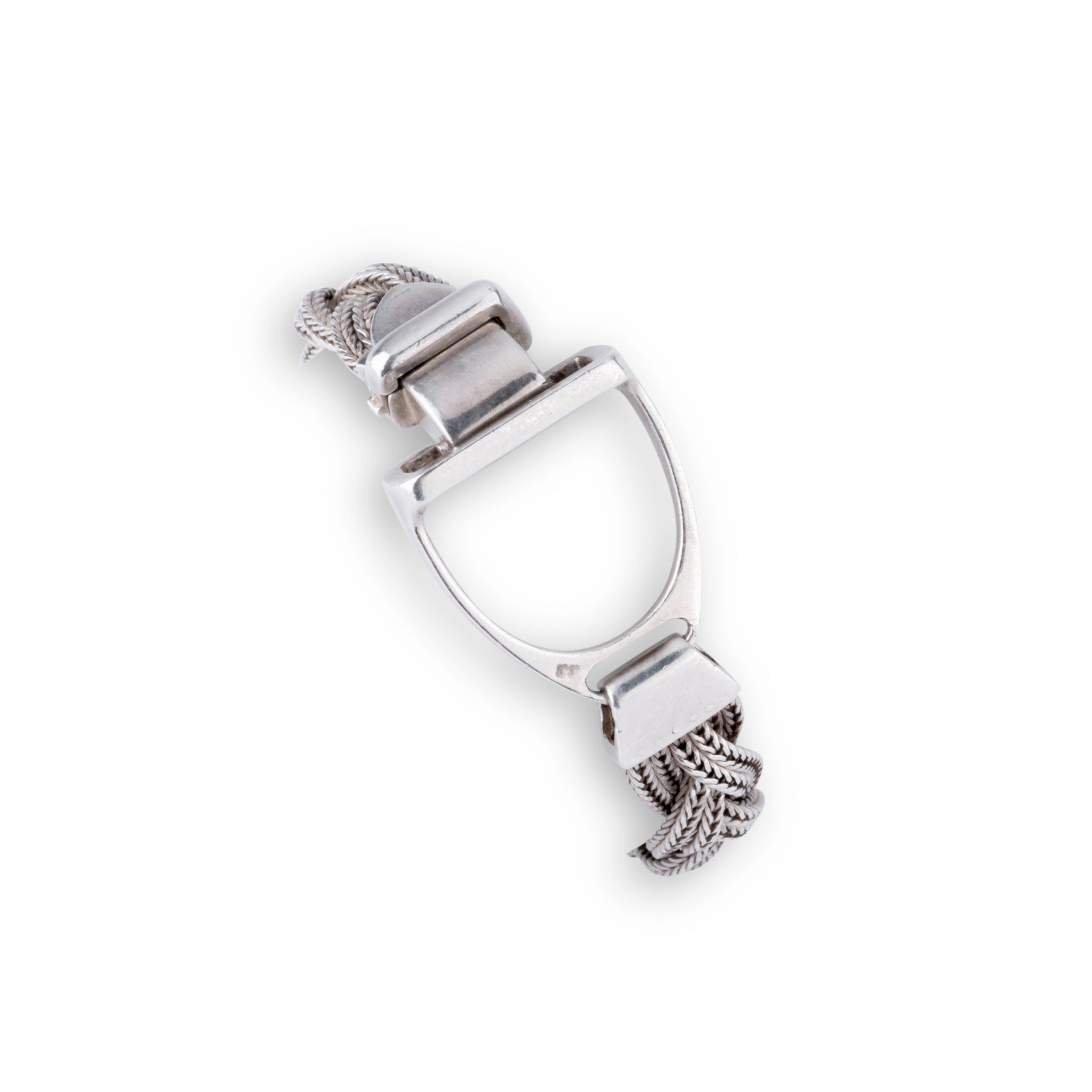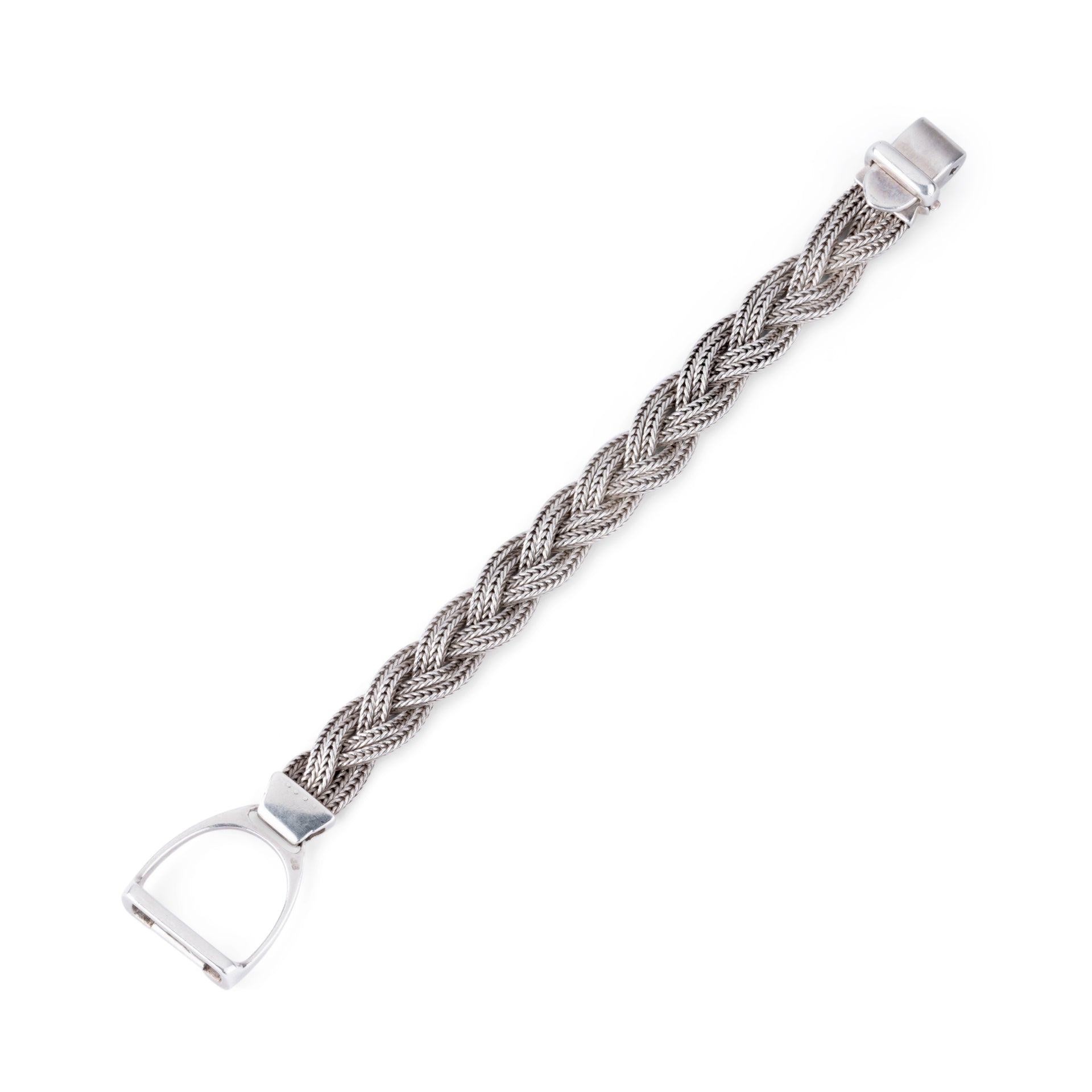 Bracelet Hermès modèle Etrier en argent, composé d'un bracelet tressé réhaussé d'un important fermoir clip stylisant un étrier.